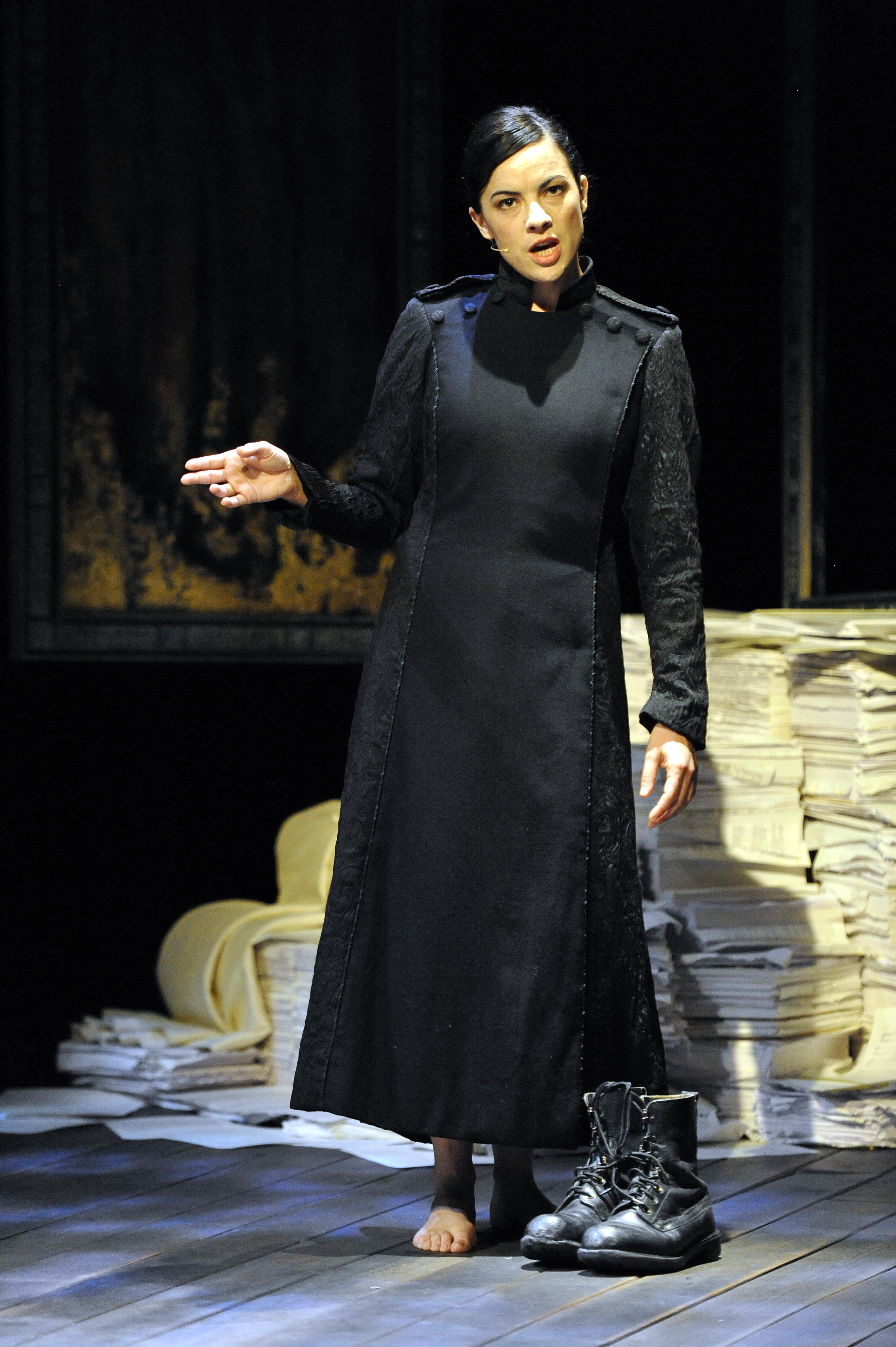 Lucrece was symbolically aligned with white (though roses competed with lilies at points, a nice proleptic moment) and a spot-lit pair of poignantly dainty white court shoes often stood in for the chaste wife, and were used by the solo performer to help to build the narrative, in one of her several personae as the narrator. This contrast of heavy-duty and frivolous shoes was replicated in many ways throughout the play. It’s a poem that pivots around a lot of polar opposites. When she was finally unveiled, at the point of the rape, she was wearing a white shift, the only aspect of the design I’d quibble with, as I felt it was too modern. This, of course, might have been the point, but a simple shift to the floor in a neutral style would have done the job more elegantly, I’d suggest. The final costume change, which had to do double service for both a dignified suicide of the victim and the victim’s father, a very beautiful white cape-style coat, was inspired, however, for reasons I’ll explain below.