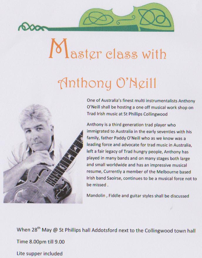 When: Anthony O’Neil will bring a guitar, mandolin and fiddle on 28 May and a Flute Workshop will take place with Lynnell Moran on 25 June 2014, 8-9pm