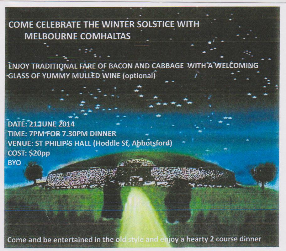 Nature of Event: Celebrate Winter Solstice with Comhaltas! Traditional fare (bacon and cabbage) and mulled wine (yum!). Old time entertainment.