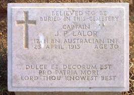 That day, Baby 700 was won and lost twice. Joseph Peter Lalor was buried at Baby 700 Cemetery, the most northerly of the old ANZAC cemeteries. Ten special memorials were erected to men known to be buried there. His Latin epitaph is a quote from the Roman poet Horace and it reads in English: ‘It is sweet and proper to die for one’s country. Thou Lord Knowest Best’.