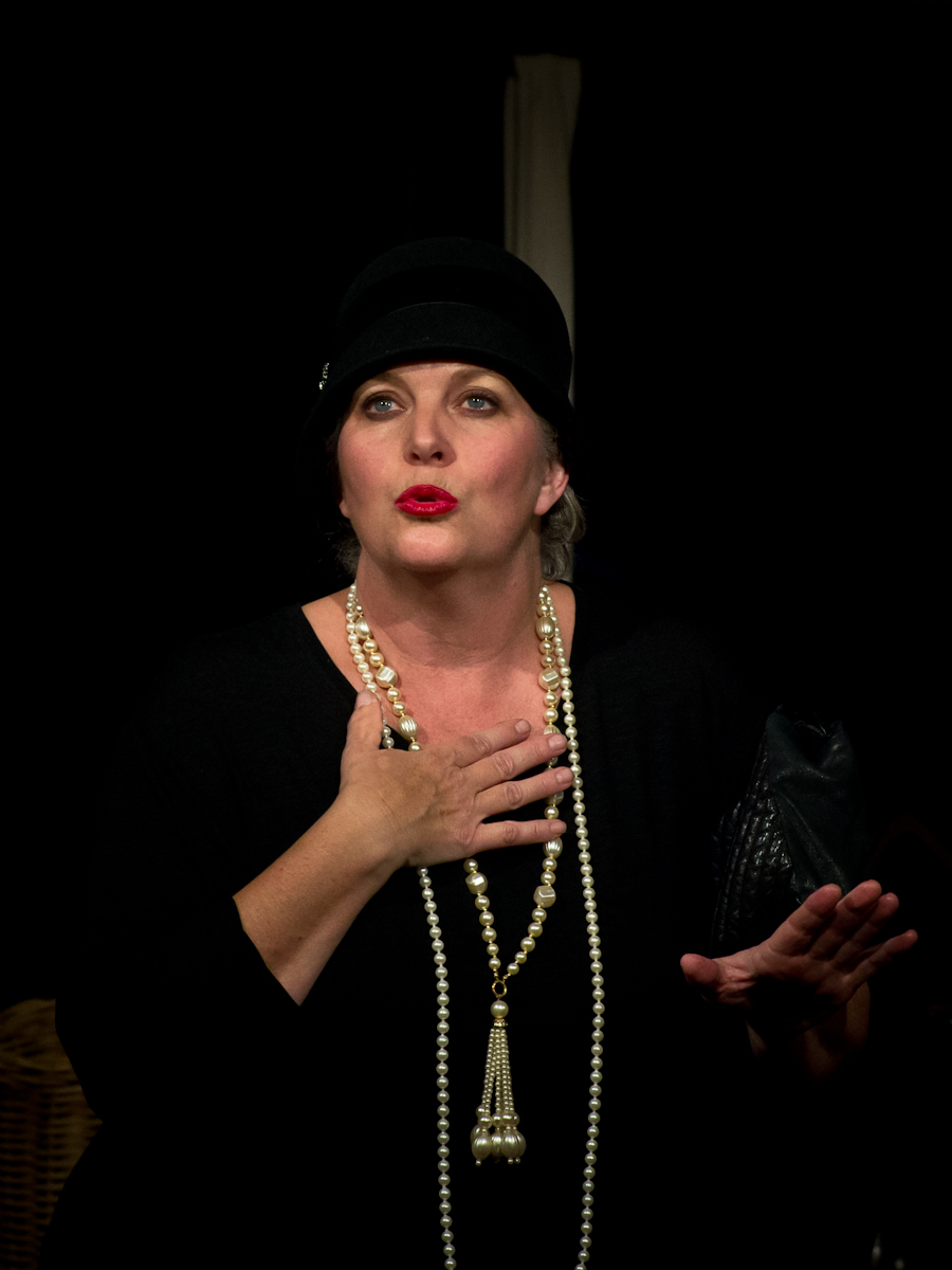 All the women showed great versatility in their multiple parts. Bridgette Burton as Mimi, Gigi and Fifi, Charlie’s clone-like assistants, was cleverly and beautifully costumed in the same Breton top but with differently coloured wigs, berets and scarves for each young woman. Decorative and charming with her exaggerated French accent she had great comic timing as the several recent graduates from the Sorbonne. Sarah Plummer was a voluptuous Molly, a simpering Gertie, a skittish Lucia and clearly enjoyed giving a hilarious performance as Theda Bara’s Penelope chewing the scenery.