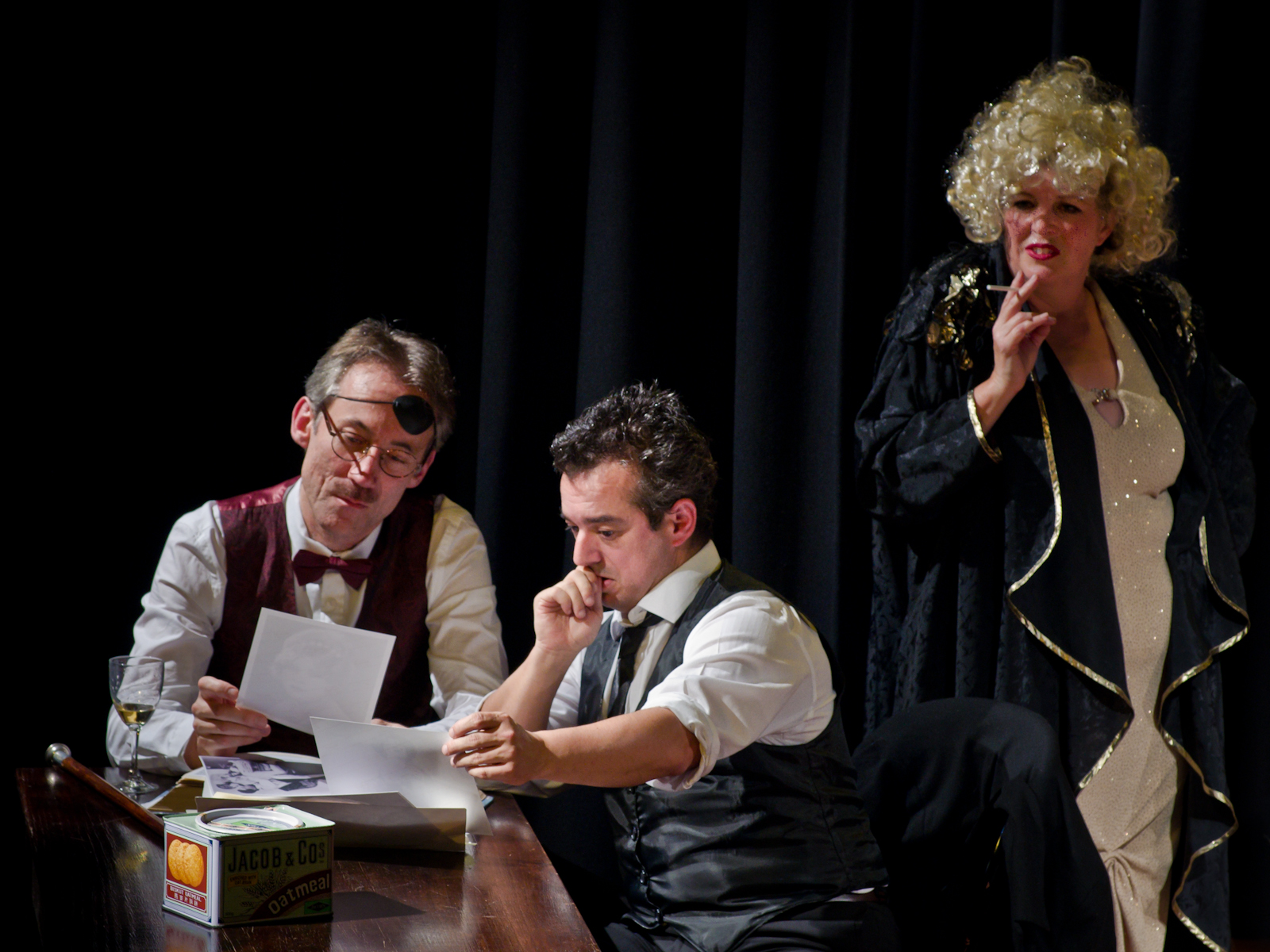 As for Steve Gome as Joyce, he looked spookily like the man himself with long face, spectacles and eye-patch, and was an extraordinarily charismatic stage presence. A dirty laugh and wicked grin contributed to his infectious charm as he responded appreciatively to Mae’s dictum that ‘those who are easily shocked should be shocked more often.’ But alongside all the fun, from the beginning, Joyce’s enthusiasm for the medium of cinema is clearly articulated in the play as a serious appreciation of its artistic possibilities. Gome succeeds in investing his character with a convincing passion for his art, so the theoretical discussions in the script avoid sounding too didactic. He answers Chaplin’s pompous claim, ‘I work in the artistic medium of the twentieth century’, with his confession that ‘visual illusions fascinate me…cutting…flicking from present to past to future and back…time-lapse…those magical transformations when you simply stop the camera… so much psychology’, this delivered with a sincerity which rings true. And then, in referring to Finnegans Wake: ‘In my new Work in Progress I do admit Charles, I’m using many ‘tricks’… [like Georges Méliès with]…’his persistent experimentation, illusions, transformations…’ Joyce’s idea of cinema is more sophisticated than Chaplin’s. Charlie of course is not interested in discussing any other director’s talent. Later Joyce is more careful to voice his admiration for Eisenstein whose ‘verbal montage is a little like my montage’ out of Charlie’s hearing. And it becomes clear in Charlie’s treatment of the first master scene, ‘Proteus’, that the exaggerated style of silent film cannot do justice to Joyce’s work when the miming of the actor (played by Silas James in white face with kohl outlined eyes and plastered-down hair) makes Stephen’s intensity ridiculous. Any cinema version of Joyce’s work needs sound, but Chaplin is not ready to admit that until the end of the play.
