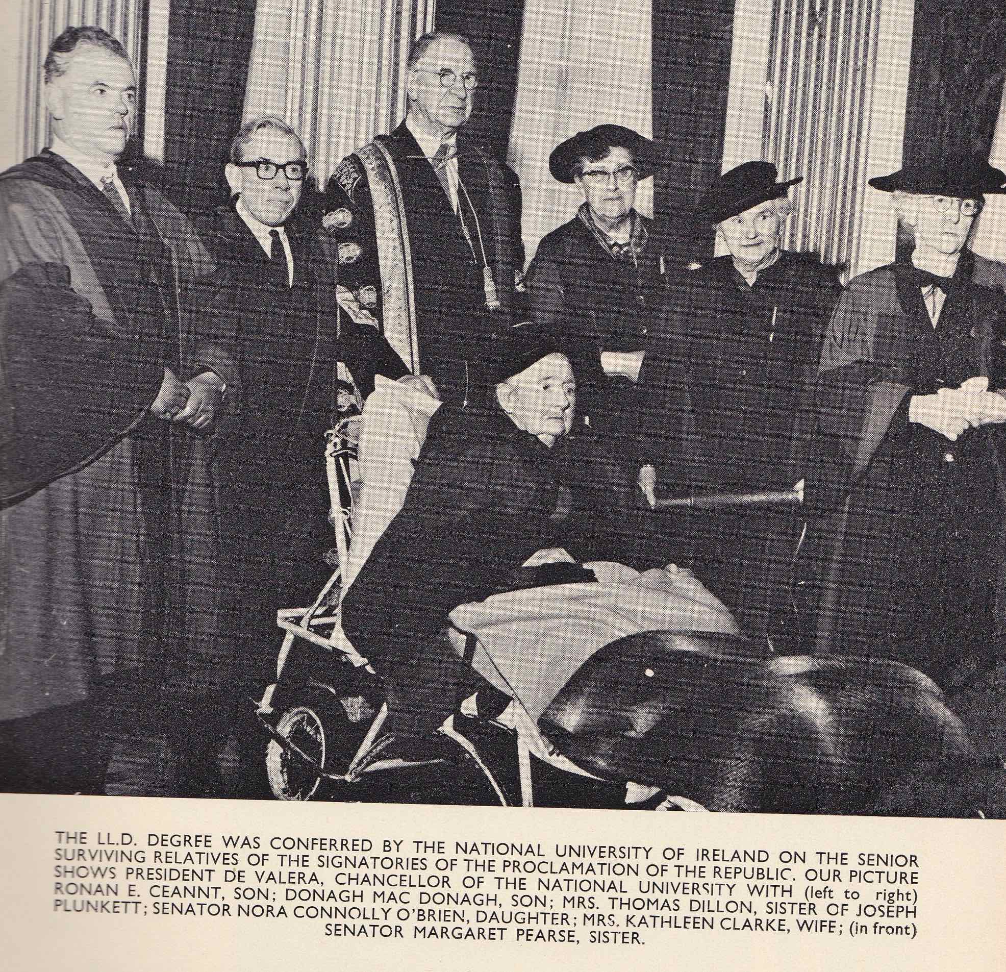 na mBan ladies of Clare, and some of the surviving relatives of the signatories of the proclamation, apparently had LL.D.degrees conferred on them, including Senator Margaret Pearse, sister of Willie and Padraig and the wife of Tom Clarke, feature in other photos. The women look strong in their frailty. Loss must have been a too familiar lineament of their lives.