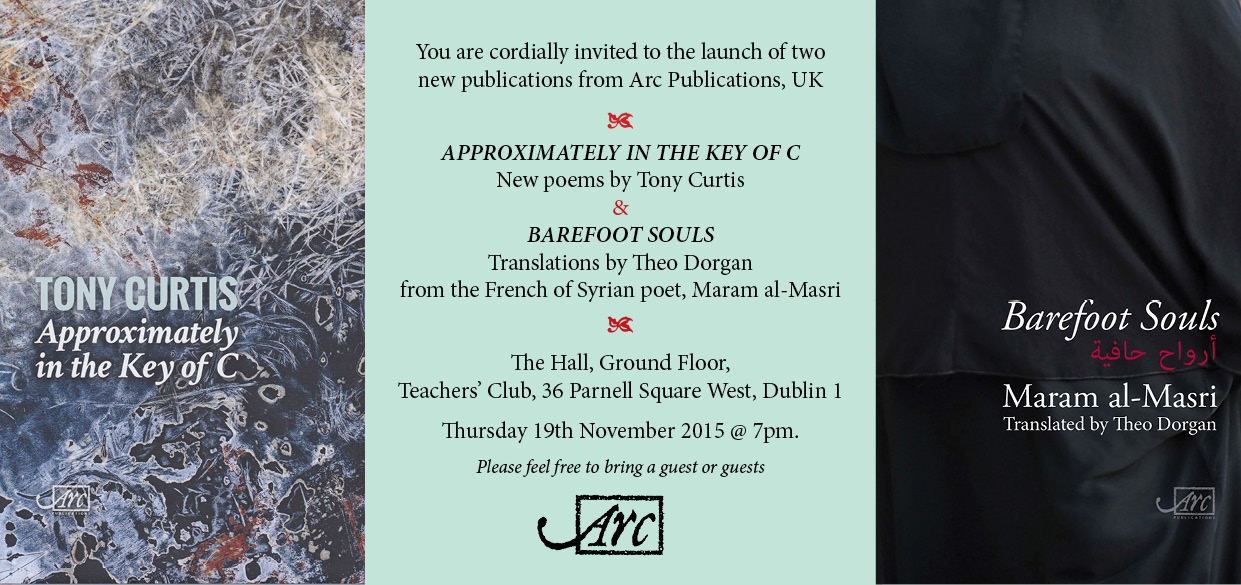 Nature of event: Book launch: ‘Approximately in the Key of C’ by Tony Curtis and Barefoot Souls: by Maral ak-Masri (French-Syrian poet): Translated by Theo Dorgan