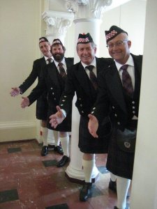 Kilted up for a performance at the Mennin Gate, Flanders, and warming up at the Victorian Parliament.