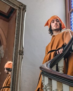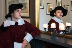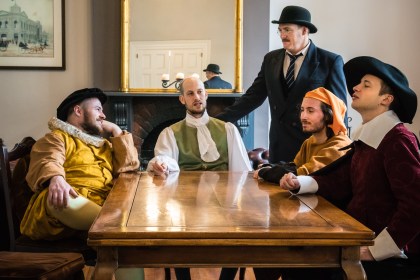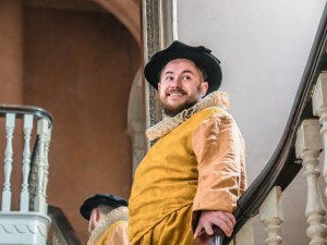 Mitch Edwards as Buck Mulligan ‘playing’ Henry VIII, Tudor style.