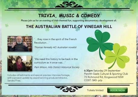 Nature of Event: A night of trivia, music and comedy, focussed on the Battle of Vinegar Hill. It features a special preview and interview footage for a film about Vinegar Hill directed by Sandra Pires, an award-winning director.