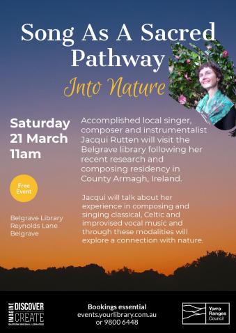 County Armagh at the Tyrone Guthrie Centre, will give a talk at the Belgrave Library about her experience in composing and singing classical, Celtic and improvised vocal music and will explore how song connects with nature.