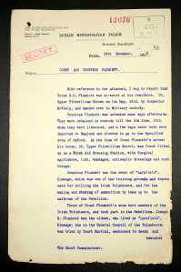 Serendipity furnished me recently with an 85-page digitised file from the National Archives of the United Kingdom, Kew, London. It is a complete file with numbered pages and comprised internal memos from and between the Colonial and the Home Offices in London, Dublin Castle and the Dublin Metropolitan Police, and some were derived from the War Office. The file was released in 1996. It has become available on some genealogical sites under the heading, Ireland, Intelligence Profiles, 1914-1922.