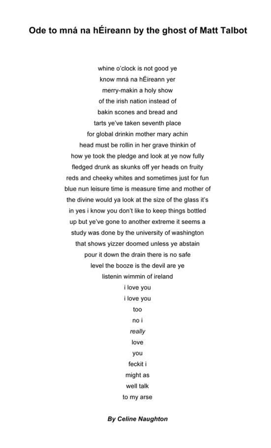 Journalist, indie author, occasional poet and dog-crazy wife and mother from Bray, County Wicklow, Celine won The Percy French Prize for Witty Verse 2020 with this offering. Competition judge Margaret Hickey describes the poem as “a beautifully crafted diatribe in the voice of the late Matt Talbot….The rhymes are clever and the rhythm speeds up as he gets increasingly frustrated… a very well-judged comic piece and the overall winner.”