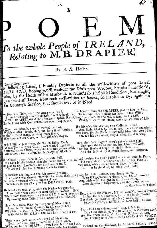 In March 1724, Swift wrote a pamphlet in the form of a Letter to the people of the nation. It was described as having been written ‘By M.B. Drapier’. The ‘author’, that is, was a draper with initials ‘M.B.’. It was a fictional authorial identity, but the printer, the twenty-seven-year-old John Harding, stated his real name and place of business on the title page. Written with a power that only Swift could infuse, this Letter was followed by another from ‘the Drapier’ in August and by a third letter in September. All dealt with constitutional issues, in particular the limits on the Crown’s prerogative with respect to coining, but they were written in such a way as to bring these matters within the understanding of everyone from a Parliamentary Peer to a street-corner cobbler. The Letters united the traditionally fractious Irish people in a never-say-die resolve to boycott this coin, each one lifting the newfound nationalistic fervour successively higher.