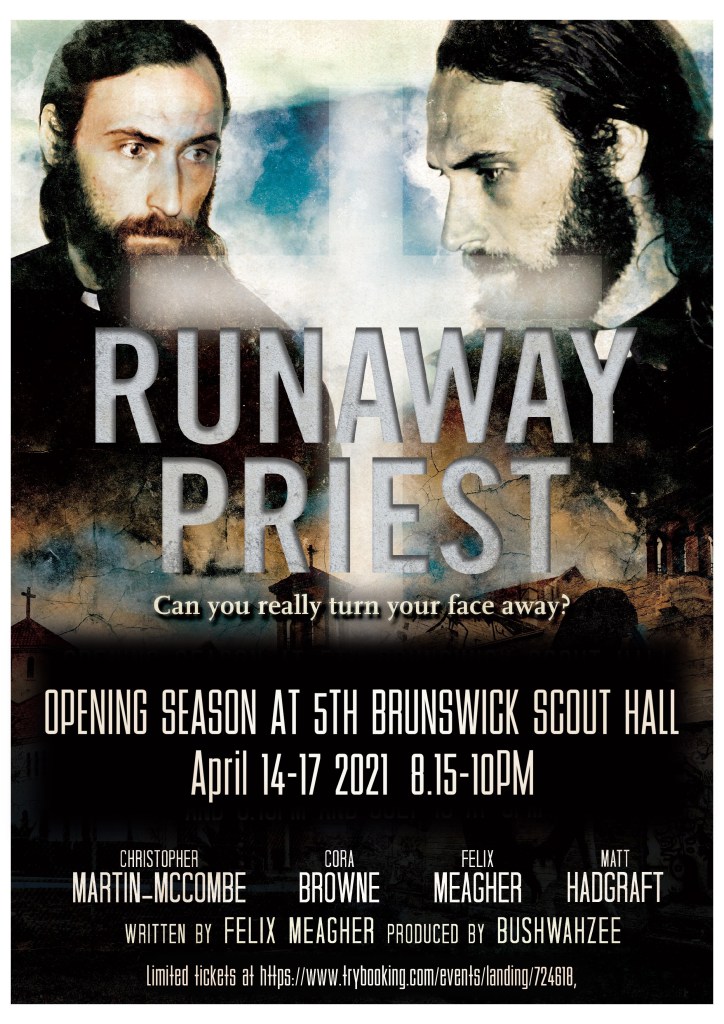 After two postponements last year Runaway Priest will open at the 5th Brunswick Scout Hall on Wednesday April 14 2021. The play features Chris Martin-McCombe as the runaway priest Kev, Cora Browne, as Maryanne, the devoted churchgoer whose 14-year-old son has gone missing, and Felix Meagher as the authoritarian and predatory Monsignor Jonah. Runaway Priest also features the gifted Matt Hadgraft on keyboard. The story is set in an imaginary place, Valley Lane, which is situated just down from the Valley cathedral, and known to the locals as the Street of Sighs. The play examines the issues of abuse within the church, homelessness, and asks the question, can we really turn our faces away?