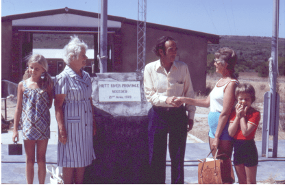 Late in 1974, Daisy travelled back to WA by car for a short holiday, again with her second son John and his family this time. They caught up with lots of the greater Cunningham family and also travelled to Geraldton for Daisy to refresh memories of her past there. They toured Geraldton and John’s family were amazed that Daisy showed little interest in what they showed her. They only found out later after Daisy’s death in 1980 that she was certainly born in Geraldton hospital, but spent no other time there. During this visit there with John and family they also travelled a bit further north to spend time with another group of Cunninghams; these were her older brother Cecil’s family who were having a beach holiday at Kalbarri. Before arriving at Kalbarri, they took a detour to enable a visit to the Hutt River Province which had recently been declared a province by ‘Prince Leonard’, seceding from the Commonwealth of Australia. The photograph shows Prince Leonard welcoming Daisy with John’s family.