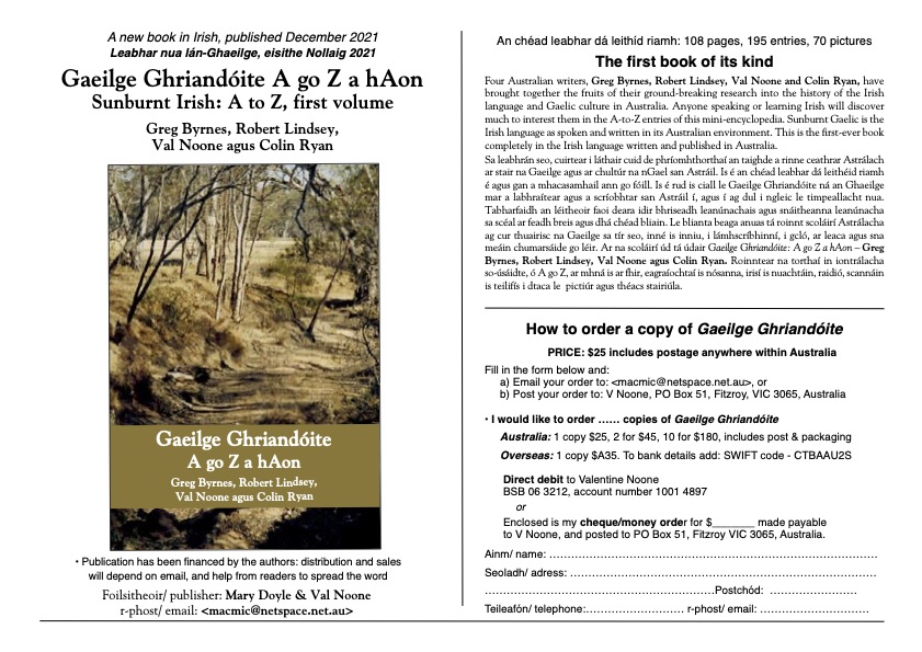 Gaeilge Ghriandóite A go Z a hAon (part one) is the full title of this book. It is 105 pages including a publications list: books, journal articles, and websites; and a list of Irish words for Australian English words that will be of great help to writers in Irish as well as speakers e.g. a mhic ó for ‘mate’, and tá sé i gceart for ‘she’ll be right’. The promise of a part two is satisfying. Congratulations to all for this initiative and for bringing it to publication especially under Covid19 restrictions. Obair den scoth!