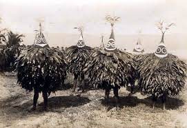 Early one morning on my way to Rabaul with my family we did not see even one woman. However, we overtook many men on foot and on bicycles, all moving in the same direction with their bodies naked from the waist up. Each wore a bright red lap-lap or long piece of cloth knotted at the hip to form a skirt. Eventually we saw 500-600 Tolais come to a stop. Then, out of the bush stepped a figure with naked legs. It had a pyramid-shaped hat that covered its face. On that were painted round eyes and a laughing mouth. It also wore a dress made of coconut fronds that swayed as it moved. Observing from a great distance, we noticed that the strange figure, a Dukduk, disappearing back into the bush for a while. The Tolai kept moving until they were up to their knees in the sea and then they sang a piercing tune. Not one, but two of the strange figures appeared before them, dancing on a canoe to the tempo of the singers, accompanied by the beating of drums made of thick bamboo. One was the Dukduk and the other the Tubuan. Other Dukduks then appeared with the Tubuan taking centre stage showing off his pair of prominent feathers on the tip of his headgear.