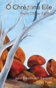 The startling blue of the sky, the cool white of the ghost gum branches, the plump burgundy rocks evoke the book’s contents, rich poems in Irish with English translations reflecting the unique style, background, and world view of each poet: one born in Ireland and writing in Irish in Perth, the other born in Australia and writing in Irish in Melbourne. In the middle of the word Chréanna in the book title, the letters an take on a rose-gold hue. Out of these different earths, Ireland and Australia, different languages, Irish and English, comes something new and special. It is a first in Irish language poetry publication: two acclaimed Australian-based Irish language poets demonstrating the treasure trove that a bilingual approach to poetry can unearth. The publisher is Australian: Bobtail Books ‘an Independent publishing house, passionate about supporting poetry and prose in both the Irish and English language.’ Their ‘aim is to ensure that the material we print is unique and supports artists who are challenging current genres and labels in literature.’