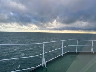 Holyhead port was a sea of cars and buses queued to board the Ulysses, a giant vessel looming in the foreground. This was not your bay ferry; this was a 12-deck ship. Later I would learn there is 4.5 kms of car and truck parking space on the lower decks. We parked the car, grabbed our backpacks, and made our way up the passenger stairwell. In my backpack was James Joyce’s Ulysses, bookmarked at the final chapter, ‘Penelope’, which I planned to finish reading whilst on board the Ulysses, travelling to Dublin to visit iconic landmarks mentioned in the book. How meta.