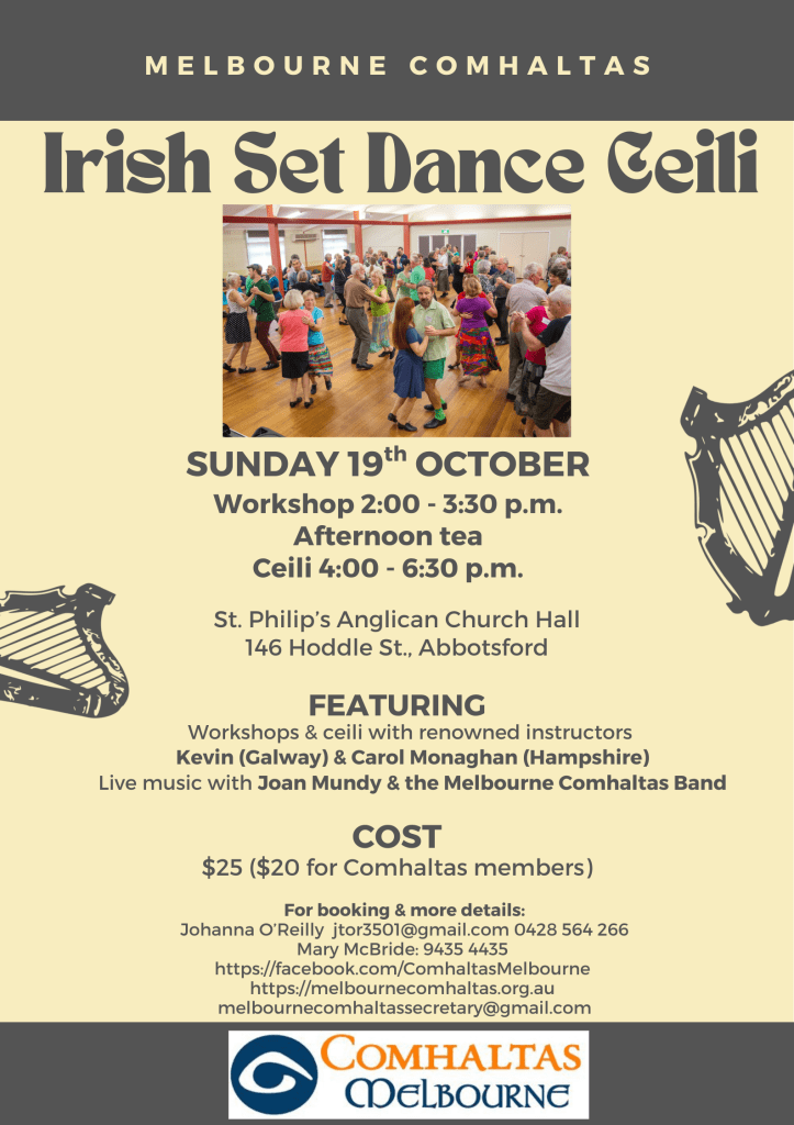 We’re excited to welcome Paul Carras our special guest tutor. Meet & greet on the Friday night, workshops and céilís on Saturday and Sunday. Music by the Melbourne Comhaltas Band. Prices range from $20 for just the Sunday céilí to $55 for the full weekend. Limited accommodation available at the Whitehall Guest House. For more info., contact Johanna O’Reilly at 0428 564 266 or jtor3501@gmail.com
