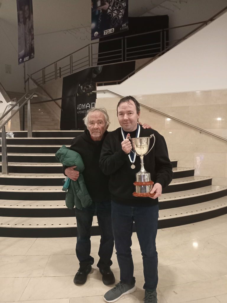 Stiofán and his father (also a recipient of Duais an Oireachtais and Corn Uí Ríada) at Oireachtas na Gaeilge in Belfast 2025.